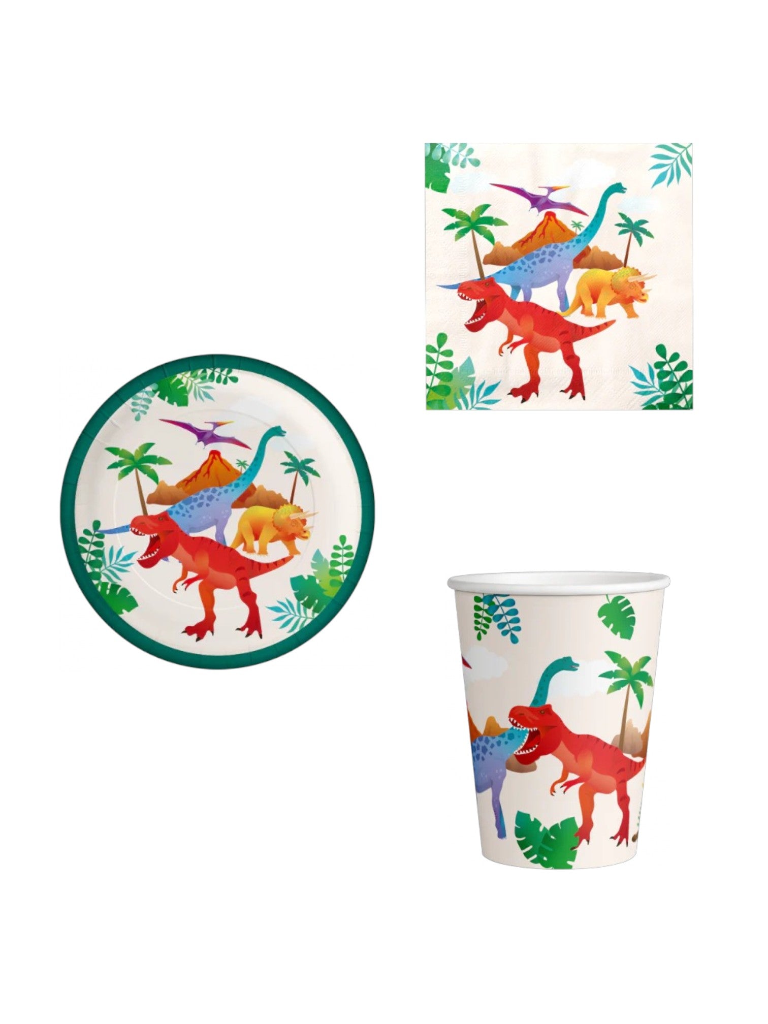 Transformeer jouw feestje in een prehistorisch avontuur met deze tafelset in dinosaurus thema! Perfect voor verjaardagen en themafeestjes, dit complete pakket zorgt voor een indrukwekkende feesttafel vol dinosauriërs. Met kleurrijke borden, handige servetten en stevige bekers in een stoer dinosaurus design wordt elk feestje een dino-tastisch succes.
