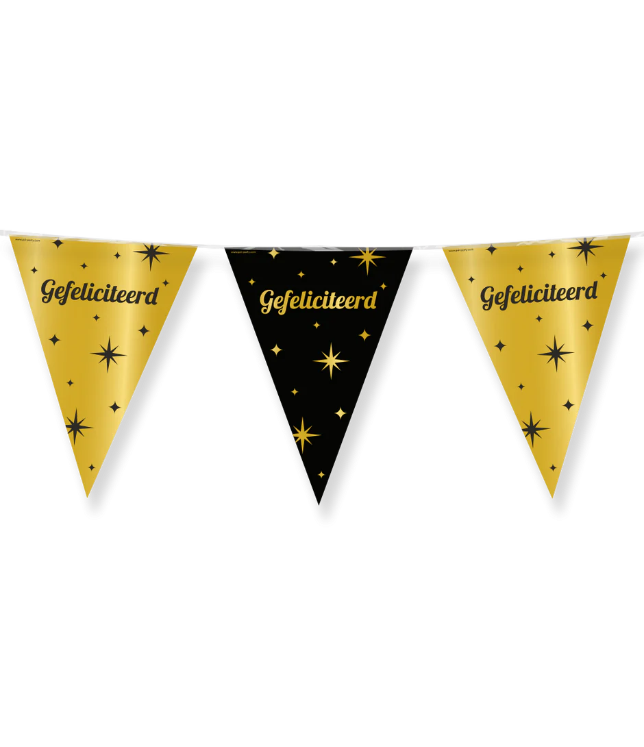 De Classy party flags - Gefeliciteerd zijn de ideale versiering voor elke verjaardag! Met de elegante zwart-gouden kleur en het stijlvolle design vallen deze vlaggen extra op. De vlaggetjes zijn aan beide kanten bedrukt, gemaakt van folie, en de vlaggenlijn heeft een lengte van 10 meter, perfect voor het versieren van een feestlocatie!