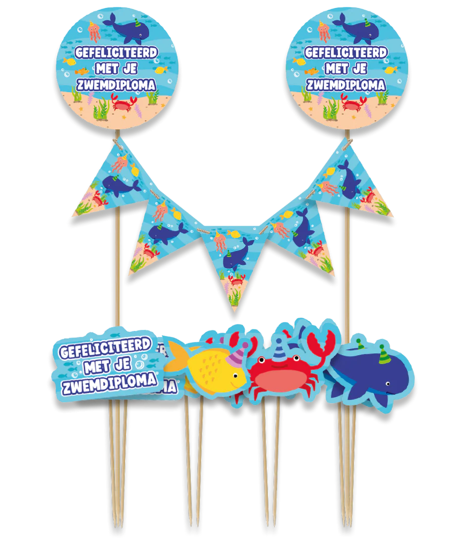 Maak van elke taart een ware blikvanger met deze cake decorations Zwemdiploma! Heeft iemand zijn of haar zwemdiploma gehaald? Dan is dit de perfecte decoratie voor in een taart. De prikkers zijn eenvoudig in de taart of cake te plaatsen voor een opvallend effect en zorgen voor een feestelijke uitstraling.
