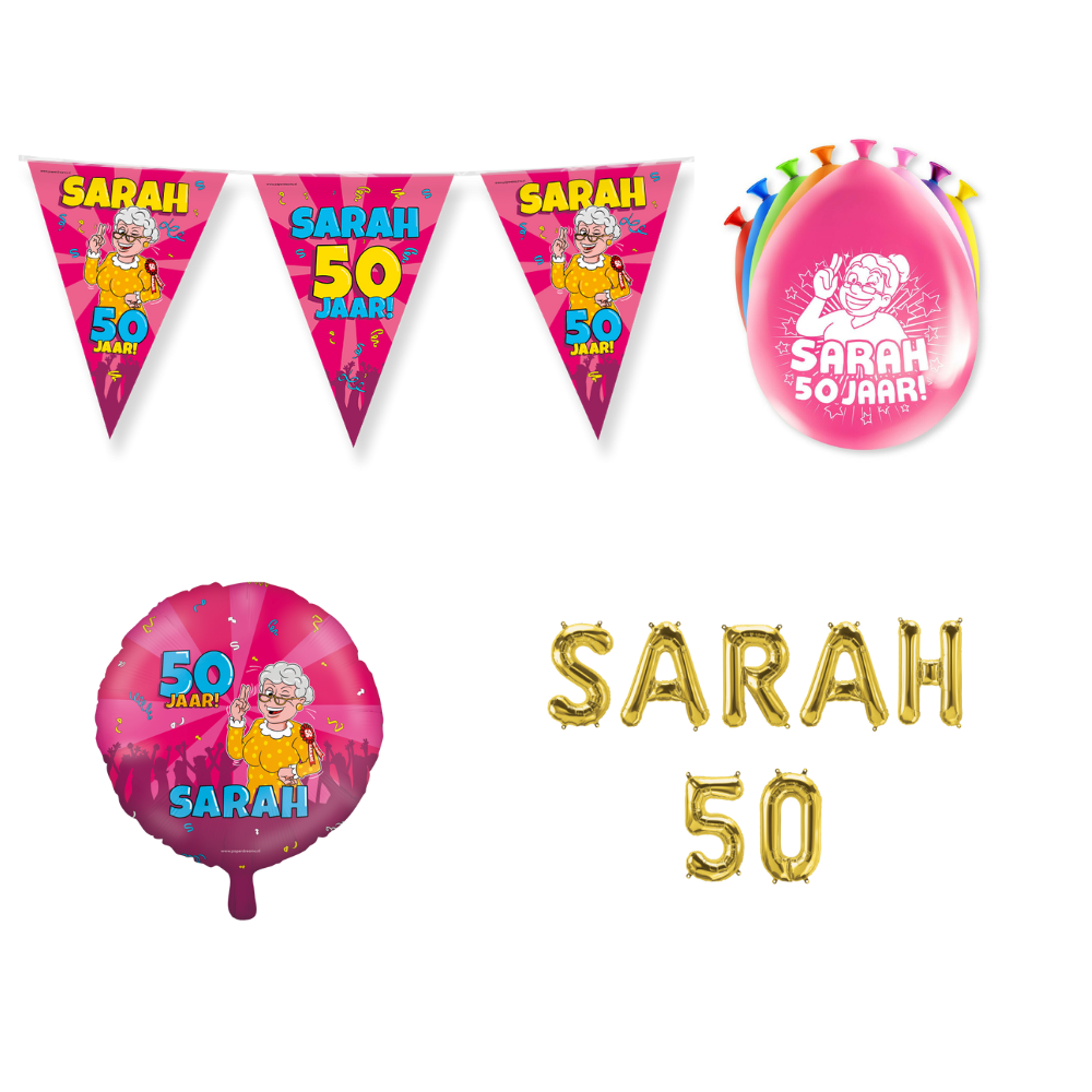 Wordt er binnenkort iemand 50? Dan mag een feestelijke versiering natuurlijk niet ontbreken! Met dit Sarah Versiering Pakket zorg je ervoor dat de jarige stralend in het middelpunt van de aandacht staat. Ideaal voor thuis, in de tuin of op een feestlocatie!